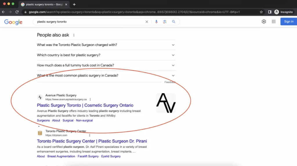 If you’re new to this, organic traffic is sessions (or website hits) that come to a website from searches on search engines such as Google. For example, if you search “Plastic Surgery Toronto” organic search is the results that show up after Sponsored results (paid ads).